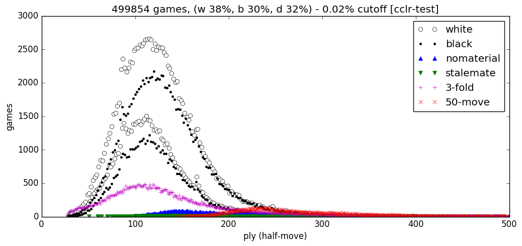 This figure shows a distribution of all the gameover types within the testset of this data. Games with over 500 plies have been excluded from this figure to keep it readable, and as such the game count is slightly smaller than 500'000 with 0.02% ignored. The double bands for black/white wins show wins on checkmates and resignations. 38% was won with white, 30% with black and 32% draw. Finally, the testset has ~86% unique positions (including history planes).