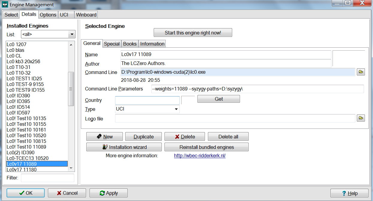 Now, where should we put all these? Let’s then create an new Leela engine for Arena, Fritz and Cutechess GUIs: