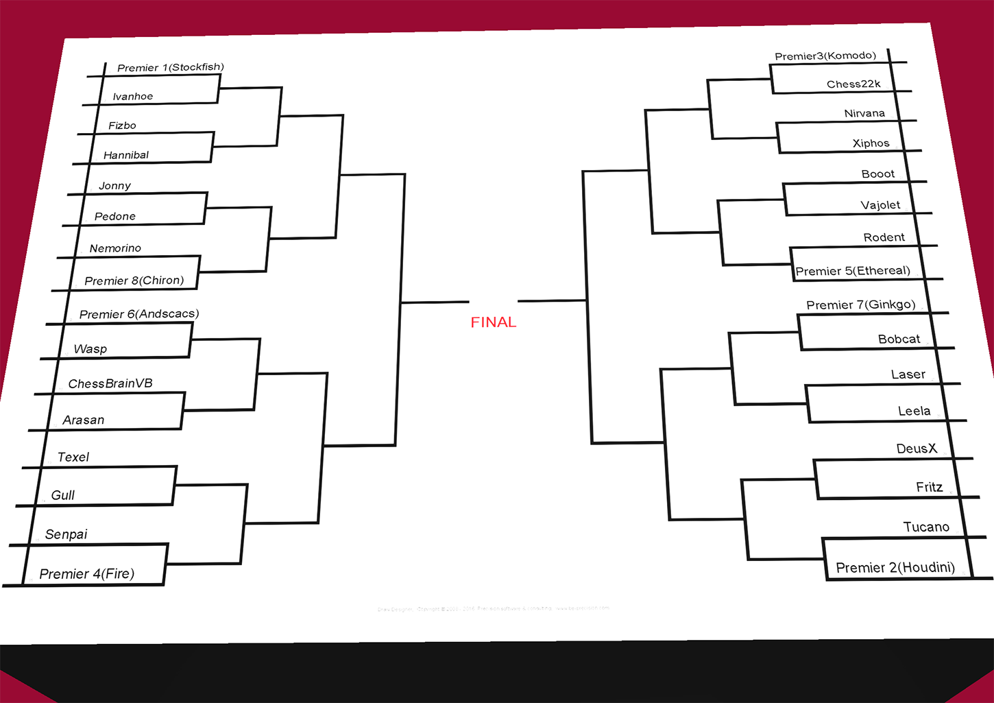 These are the current pairings and a probable, according to how Football and Basketball competitions are being run, format between the pairings. But only the round of 32 pairings holds as per the TCEC announcement, since they may choose different match ups for the next rounds.