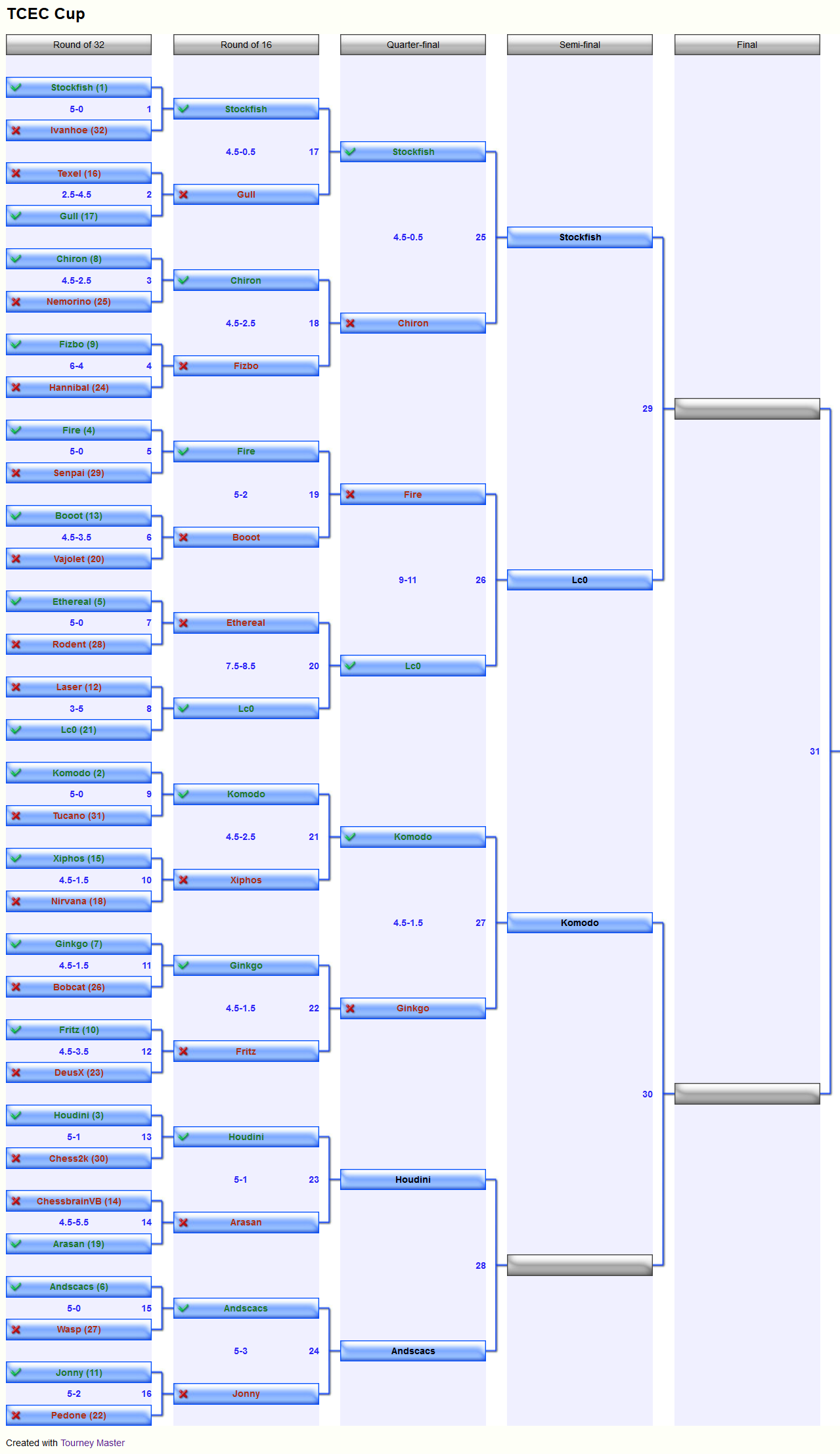 After promoting to Quarter-Finals Leela had to face a very strong opponent again, the previously (since now probably this place belongs to herself as most results show) number 4 engine in the world, Fire.